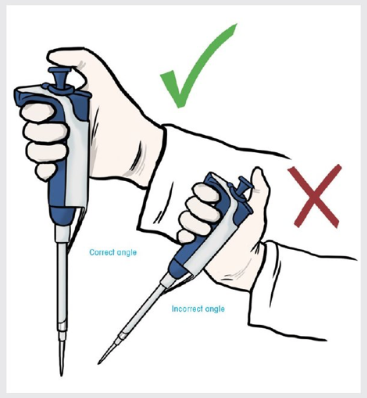Failing to hold the pipette as close to a vertical position as possible is not always easy, especially when pipetting small volumes. In these cases, it’s very common to hold the pipette and vessel at an angle, even at angles parallel to the bench. The pipette and vessel are often held this way to reach the bottom of a small vessel while looking through the content. Or, they’re held this way because it’s simply more comfortable for the lab worker’s arm to hold the pipette and vessel at an angle. Research shows that the problem with extreme angles of greater than 20 degrees is that they can significantly affect accuracy. Re-learning to hold the pipette as close to vertical can solve this.